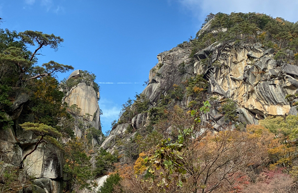 切り立った断崖の間に、奇岩・珍石・名石が並ぶ日本屈指の渓谷で、特に深緑・紅葉の時期は見事だが、冬の景色も素晴らしい。